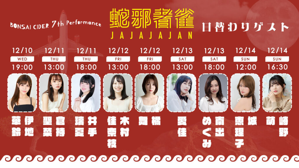Tプロジェクトの倉持聖菜が、盆栽サイダー第七回公演「蛇邪者雀」にゲスト出演いたします。