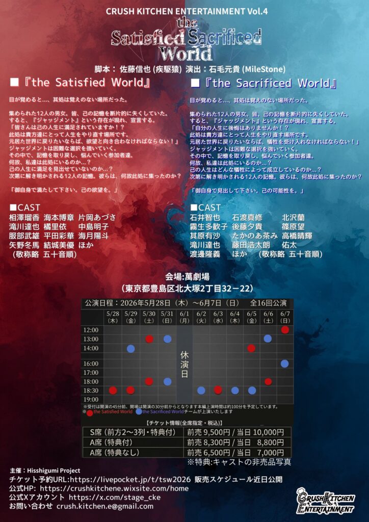Tプロジェクトの中島明子が、CRUSH KITCHEN ENTERTAINMENT Vol.4『the Satisfied World』×『the Sacrificed World』のTEAM(A):『the Satisfied World』に出演いたします。